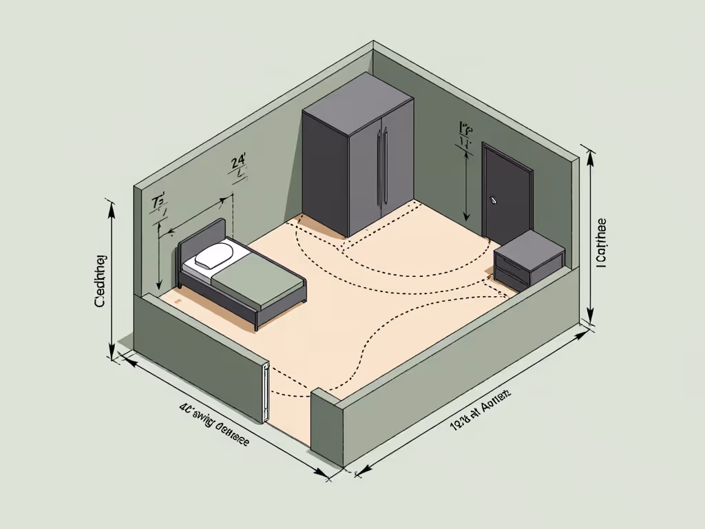 - Subtract non-negotiable obstacles: Door swing arcs (minimum 24" clearance), closet depths, HVAC vents