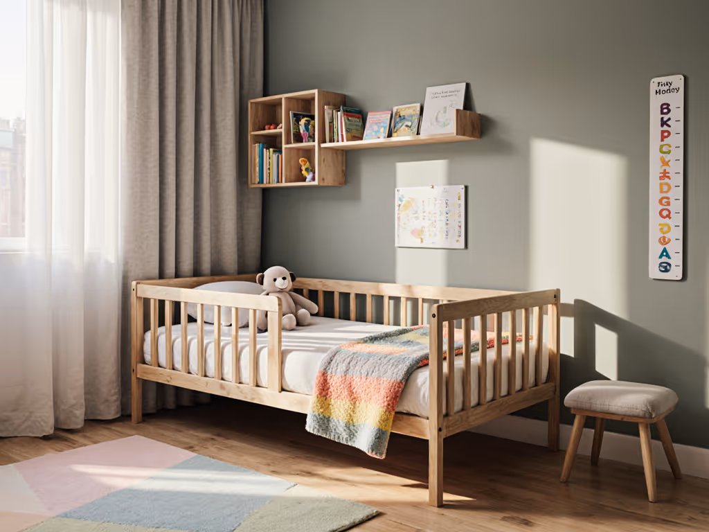 Before choosing, verify these measurements: For whole-room safety beyond the mattress, see our childproofing a toddler bedroom checklist covering furniture anchoring and cord solutions.